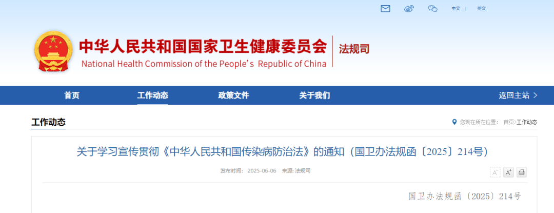 《中华人民共和国传染病防治法》(以下简称《传染病防治法》)已于2025年4月30日由十四届全国人民代表大会常务委员会第十五次会议修订通过,将于2025年9月1日起施行。为做好学习宣传贯彻工作,现将有关事项通知如下: