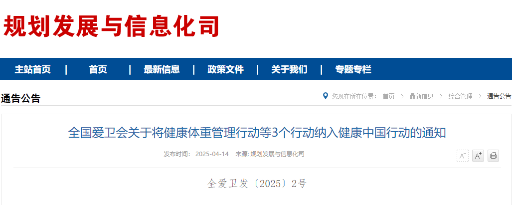 全国爱卫会关于将健康体重管理行动等3个行动纳入健康中国行动的通知